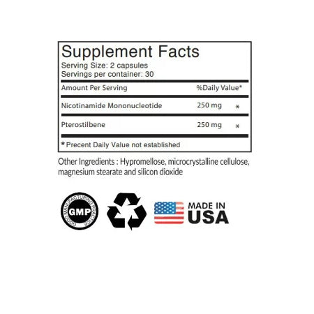 Nicotinamide mononucleotide 250mg, Pterostilbene 250mg, Hypromellose, Microcrystalline cellulose, Magnesium stearate, Silicon dioxide.